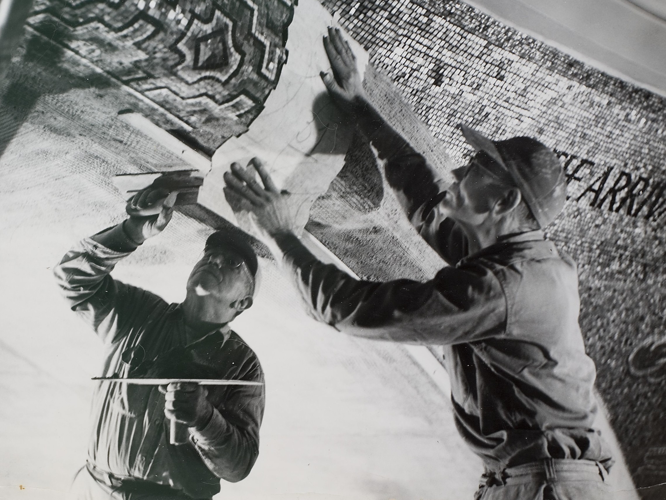 The German firm of August Wagner was contracted to install the mosaics. The company set up shop in St. Louis, becoming the Ravenna Mosaic Company. Following the design of the artisans, Paul Heuduck undertook the red and gold designs of the transept galleries, then completed the Arch of Triumph and the Arch of Creation, followed by the pendentives underscoring the main dome and the Doctors of the Church pendentives surrounding the Sanctuary Dome.