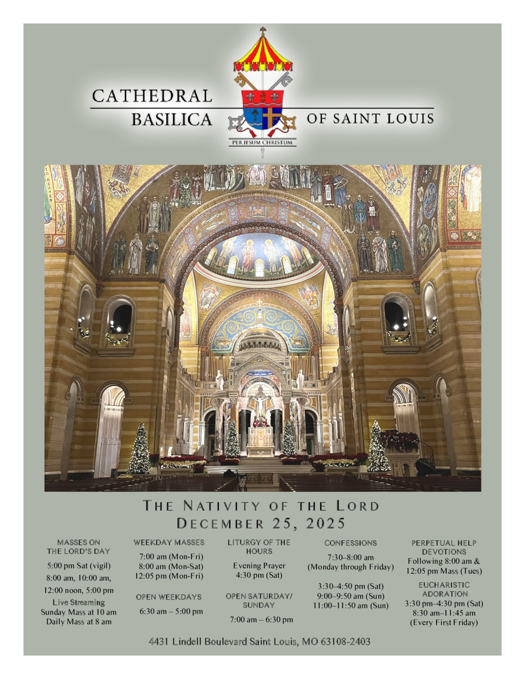 November 29, 2025 - 7:48amGood morning from the Cathedral Basilica of St. Louis! As you know, snow has arrived in our area. Our crews are working diligently to hand-shovel the sidewalks and clear the parking lots. Please take your time and use extra...