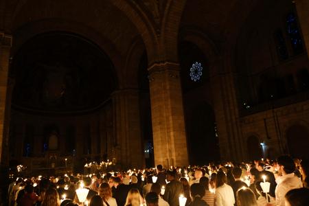Catholics hold candles during an Easter Vigil Mass in the Basilica of the Sacred Heart of Paris, France in April.