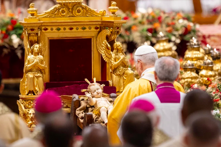Pope Leo XIV venerates a statue of the Child Jesus during the celebration of Christmas Mass during the night in St. Peter's Basilica on Dec. 24, 2025.