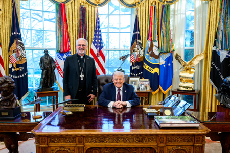Archbishop Paul Coakley of Oklahoma City, president of the U.S. Conference of Catholic bishops, meets with President Donald Trump on Jan. 12, 2026.
