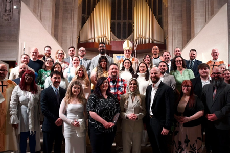 Archbishop Edward Weisenburger of Detroit with candidates and catechumens who entered the Catholic Church at the Cathedral of the Most Blessed Sacrament during the Easter Vigil on April 4, 2026.