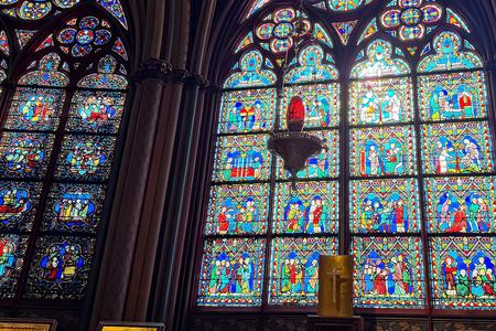 A red sanctuary lamp hangs before a Gothic stained-glass window inside Notre-Dame Cathedral in Paris.